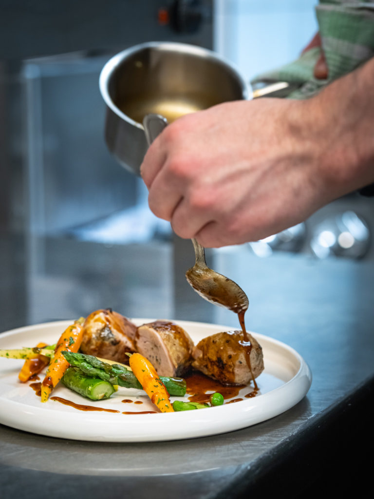 - Roasted Cod Loin with Saffron Mussel Velouté, Homemade Mashed Potatoes, and Seasonal Vegetables
