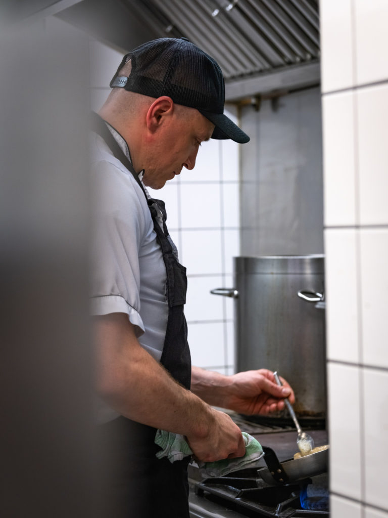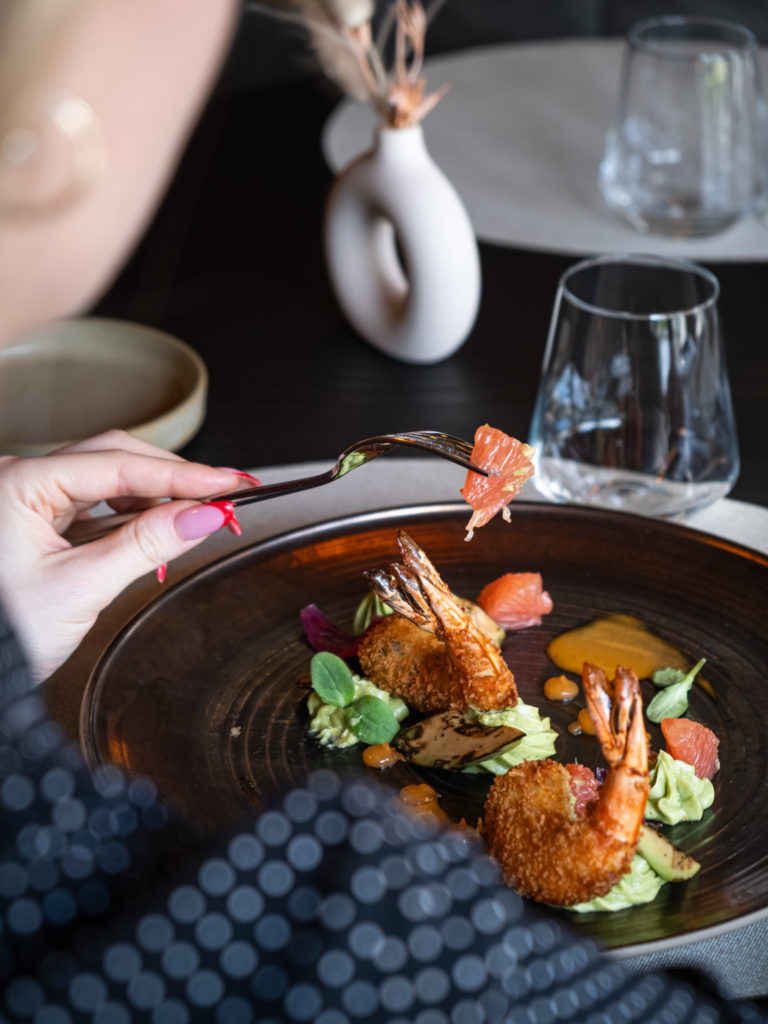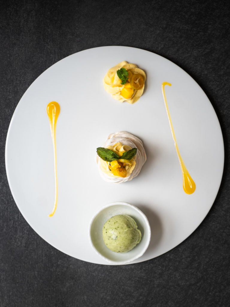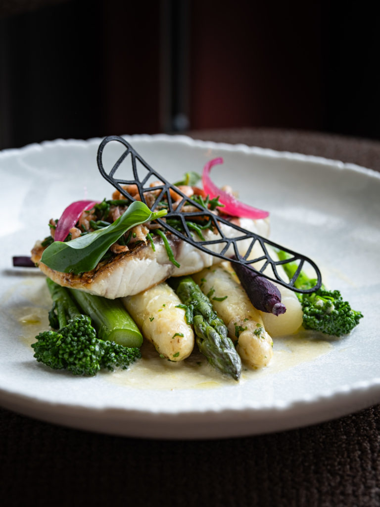 - Roasted rosefish (Sebastes), fresh pea purée, citrus velouté, sea beans, and North Sea brown shrimp